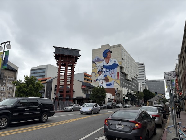写真は中心街にある「日本村プラザ」の周辺の一角ですが、ホテルの壁面に大谷選手の肖像画がデカデカと描かれていました。