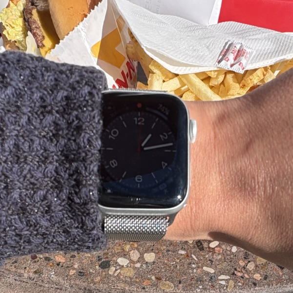ランチをバックにリストショットを撮りましたが、スマートウォッチは炎天下でリストショットを撮るには向いてないですね。ピンボケだし。