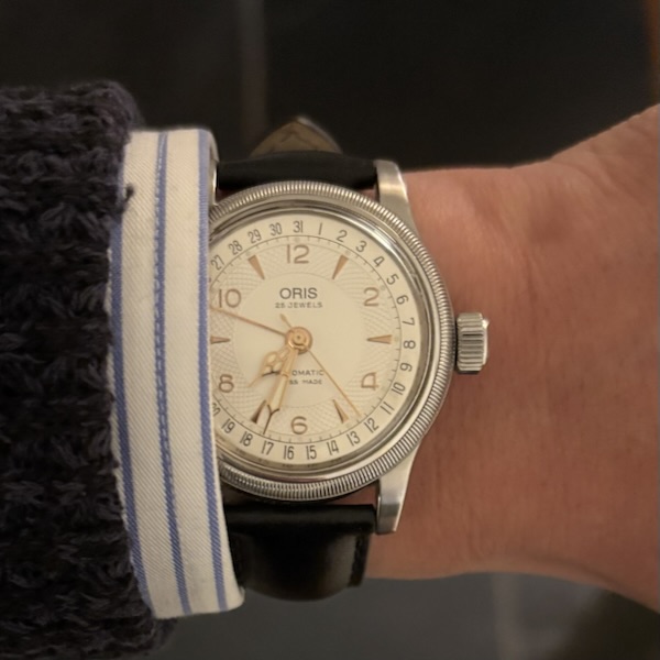 25日水曜日の時計は久々のオリスのポインターデイト、黒革ストラップ仕様。